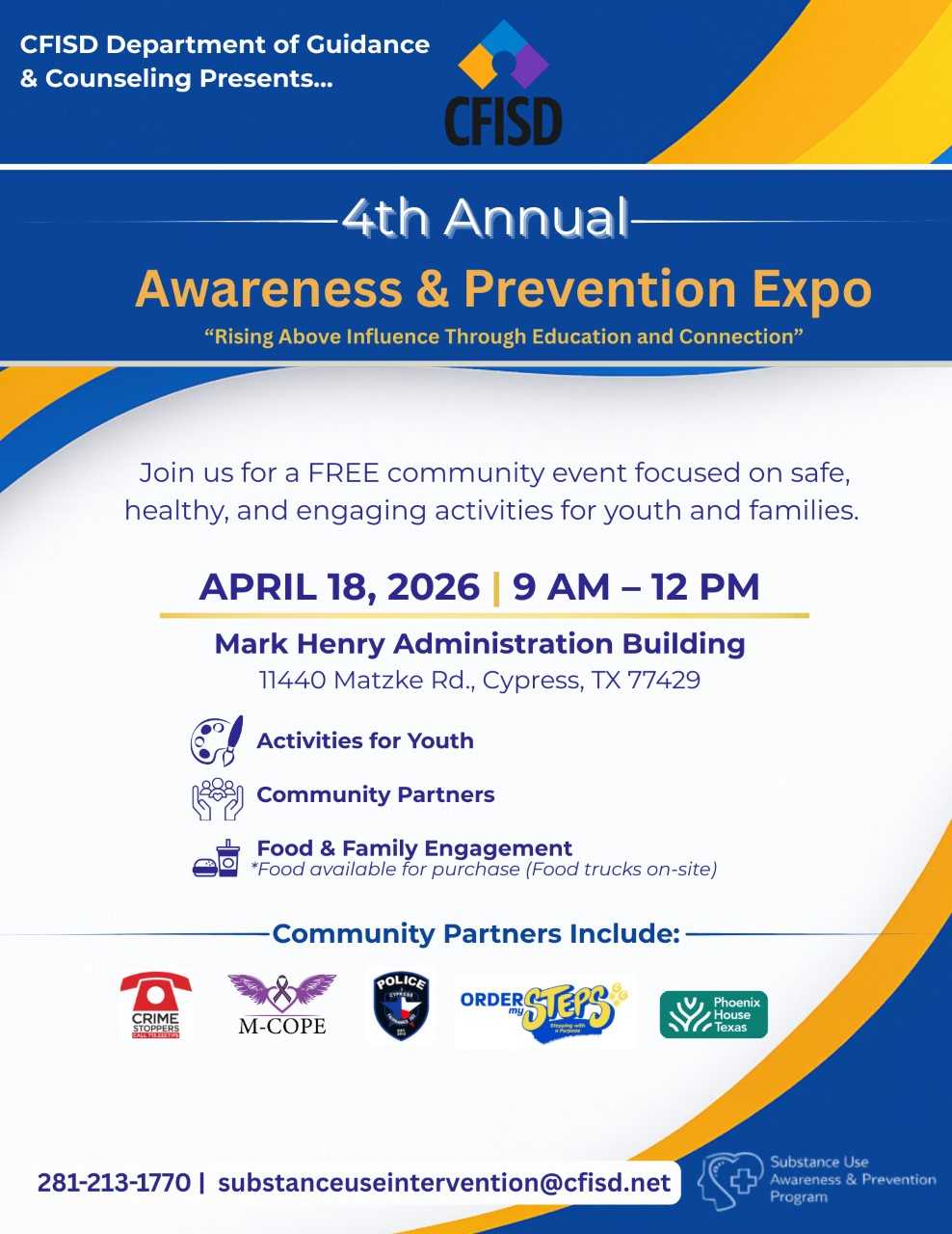 CyFair Guidance and Counseling Substance Use Awareness and Prevention Program M-COPE will have a table display with information about our programs along with free Deterra Safe Medicine Disposal Pouches. We'll also have approximately 60 of our angels from The Texas Memorial Walkway™ on display. This event is open to the public.